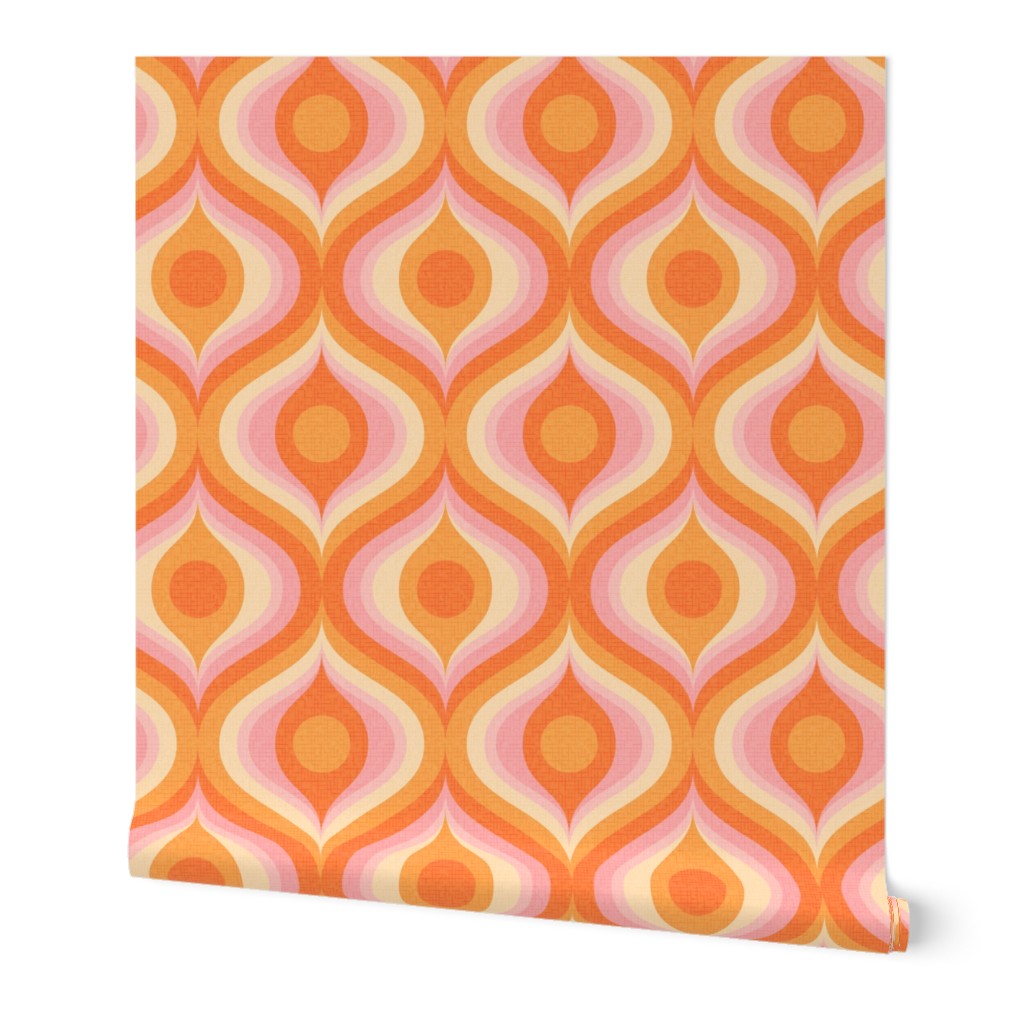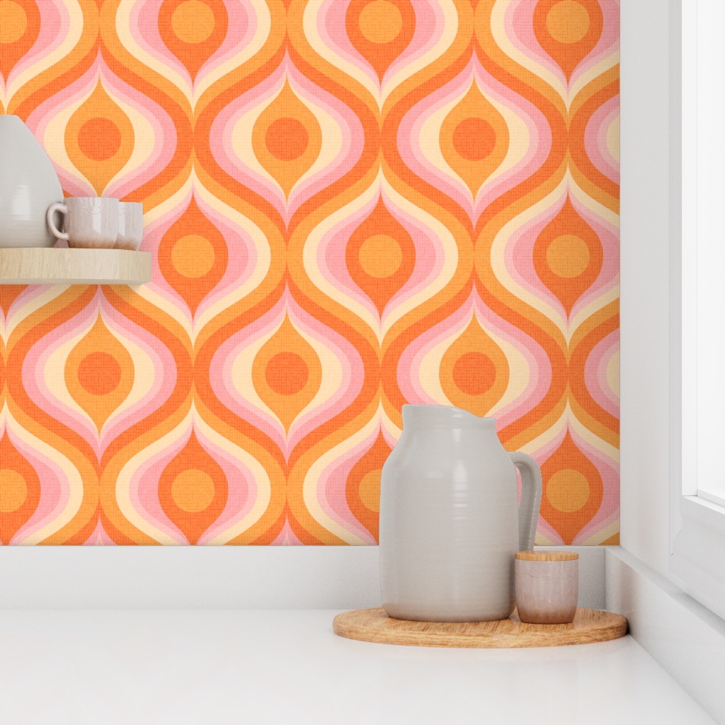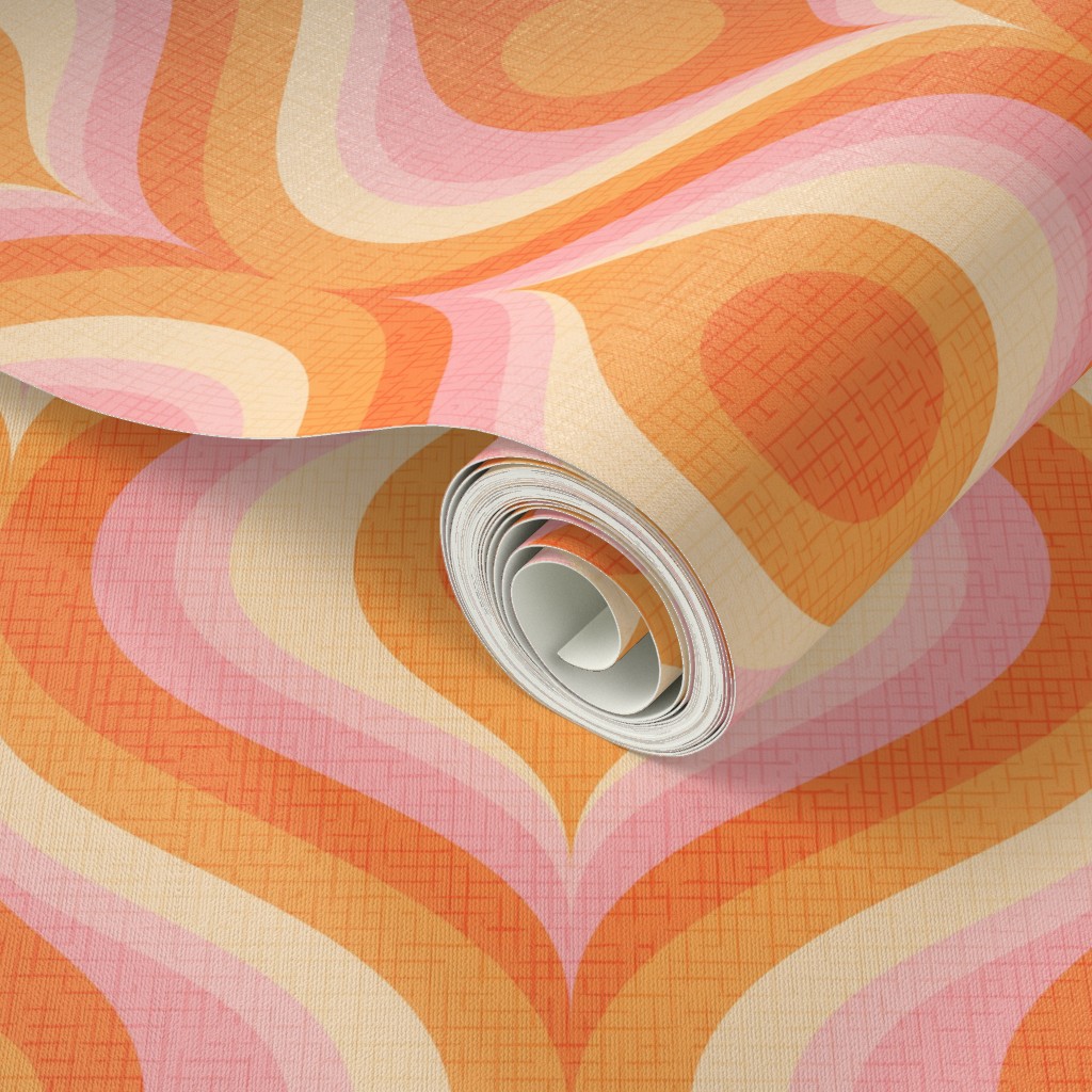 Step into a time machine and turn up the volume. Our Electric Groove wallpaper is a love letter to the 1960s and 70s, featuring a bold, hypnotic geometric swirl that radiates pure energy. Rendered in a high-contrast palette of sunset orange and hot pink, this large-scale design captures the rhythmic, free-spirited soul of the psychedelic era.