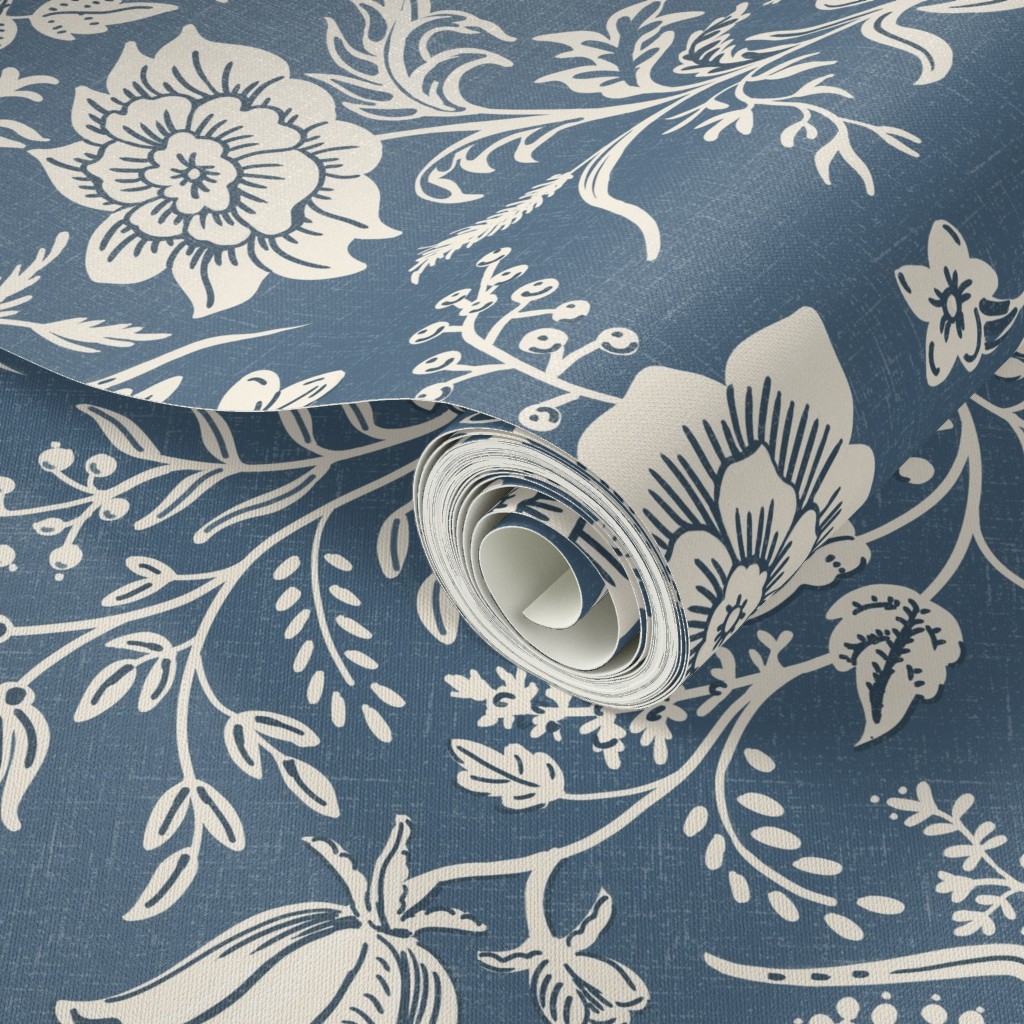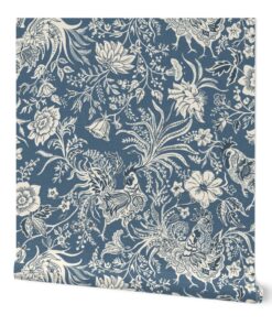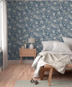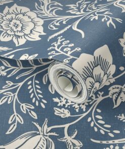 Premium Woven Linen Texture: Crafted from 100% paper with a luxury linen finish. This tactile surface gives the “Denim Blue” background a soft, matte depth, making the wallpaper look and feel like an expensive fabric tapestry.