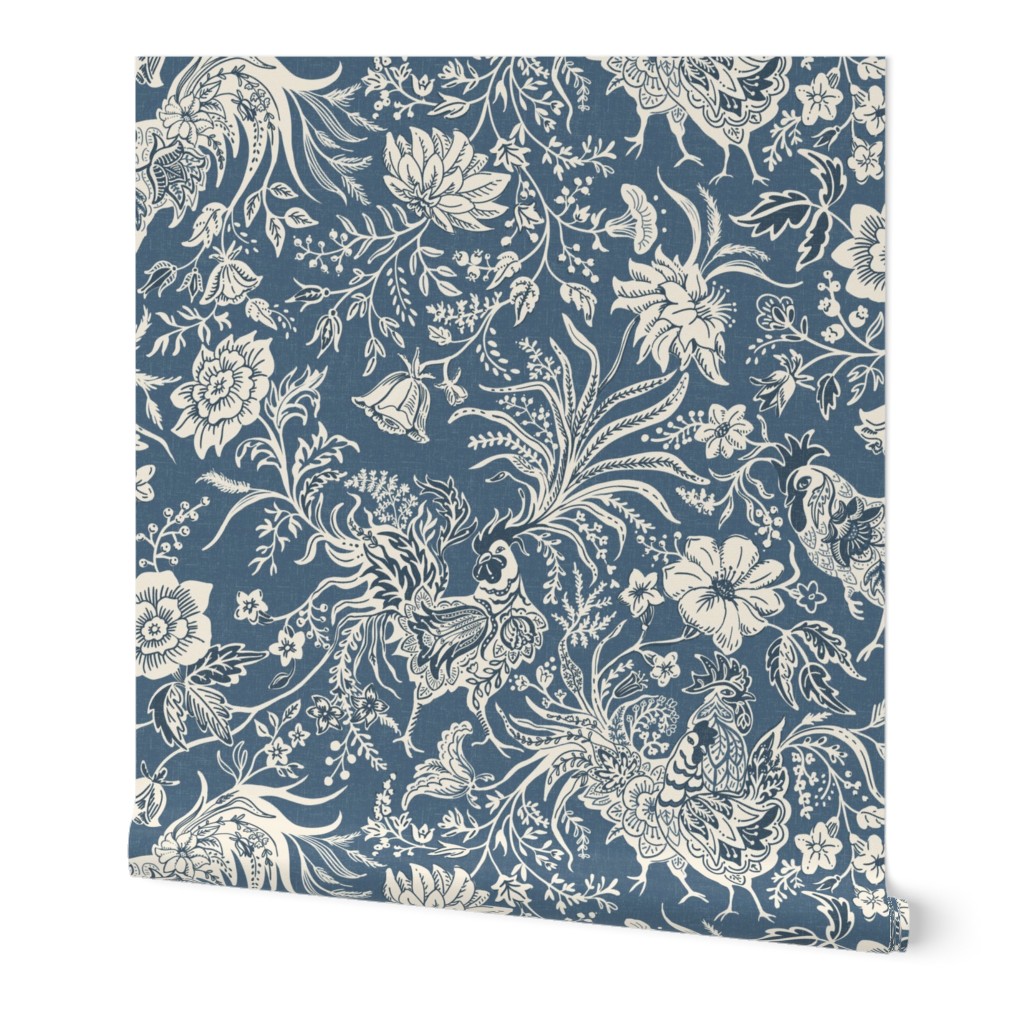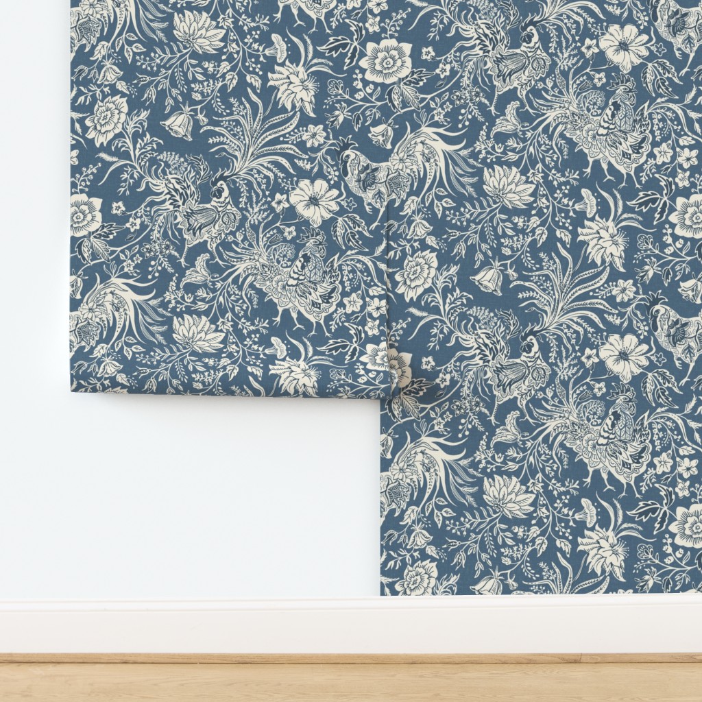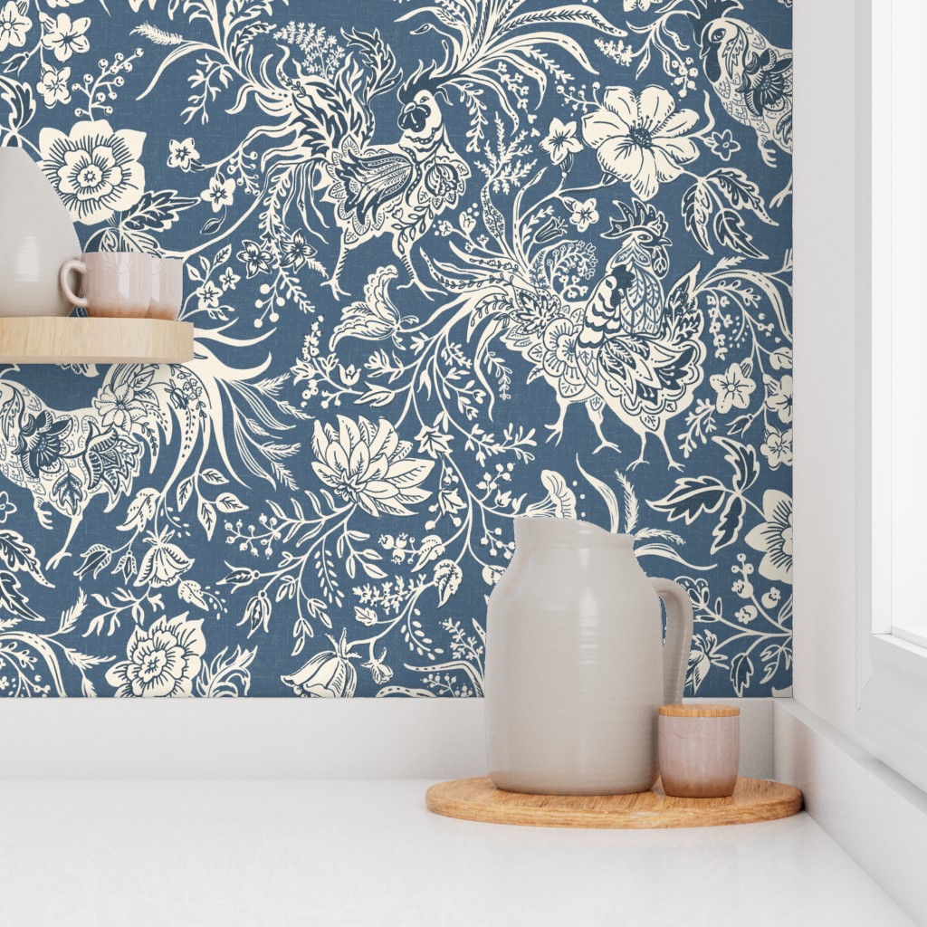 A masterpiece of rustic refinement. This design features the iconic French Bresse Rooster nestled among flowing, stylized florals. Reimagined as a Top 10 favorite in a stunning new scale and colorway, the palette of Ivory and Deep Navy set against a Dark Denim Blue backdrop offers a look that is both grounded and regal.