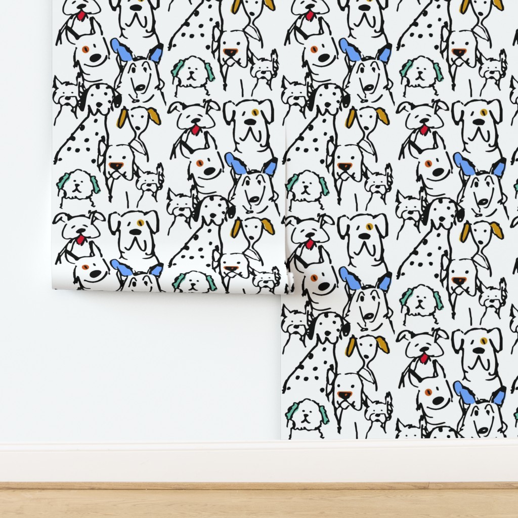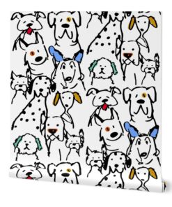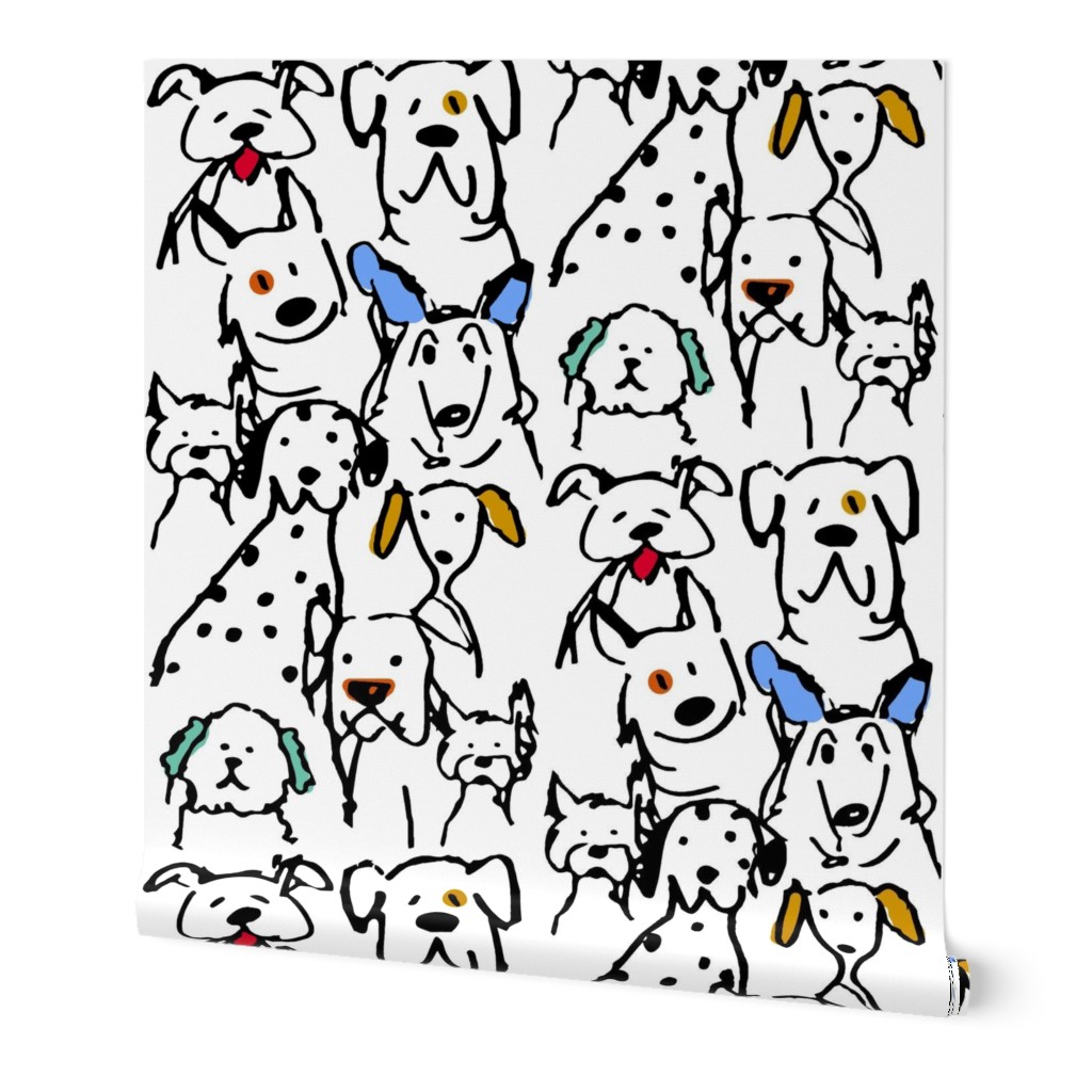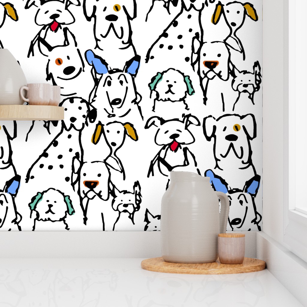 Unleash some joy on your walls! Our Color Pop Doodle Dogs features a “Large-ish” scale pattern of hand-drawn pups, each bursting with character. Featuring original artwork by Shelly Turner, this design uses clean, bold black outlines paired with energetic pops of color to create a conversational masterpiece.