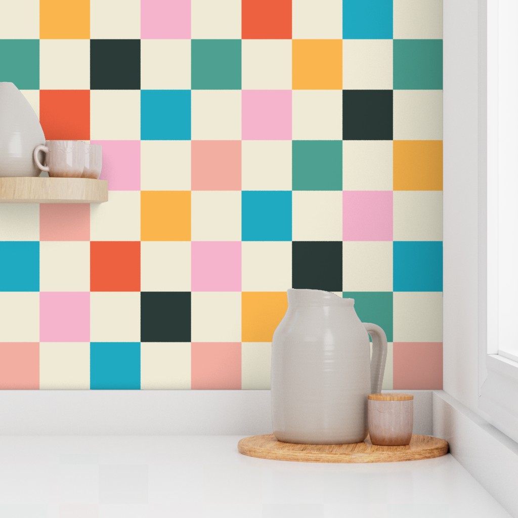 Bring on the “Dopamine Decor!” Our Bright Mid-Century Checks take a classic 1950s geometric and gives it a modern, high-definition glow. This isn’t just a checkerboard; it’s a rhythmic, high-energy pattern designed to instantly lift the mood of any room.