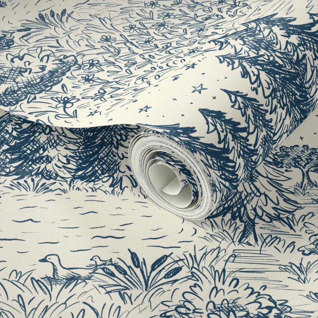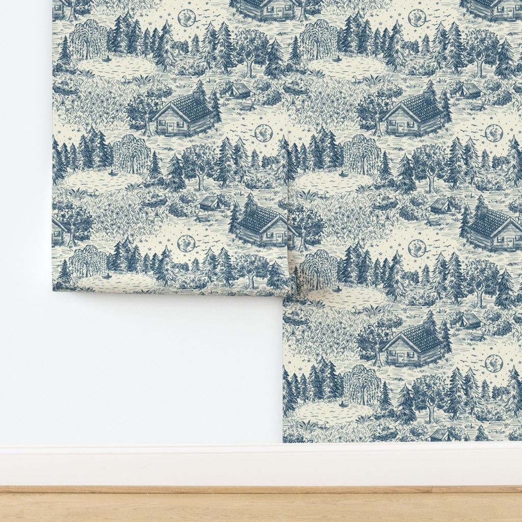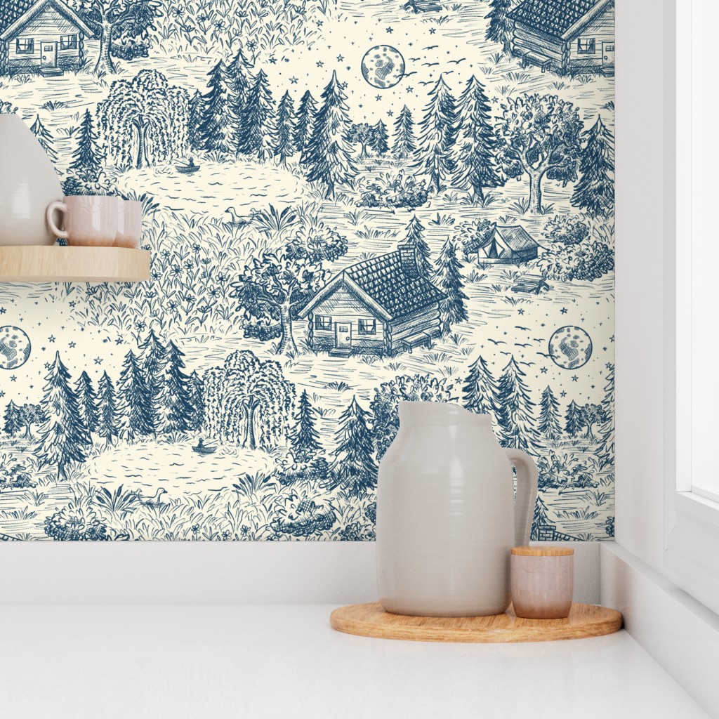 Escape to the water’s edge without leaving home. Our Lakeside Vacation Cabin Toile is a beautiful, large-scale homage to classic pastoral landscapes. Hand-drawn in a timeless vintage illustration style, this pattern features serene cabin scenes, towering pines, and quiet lake vistas.
