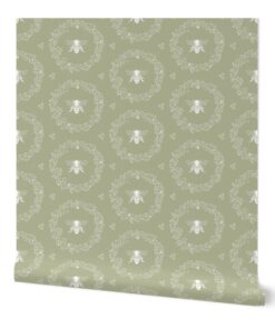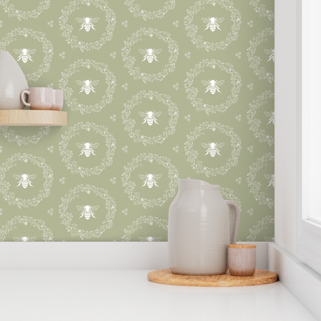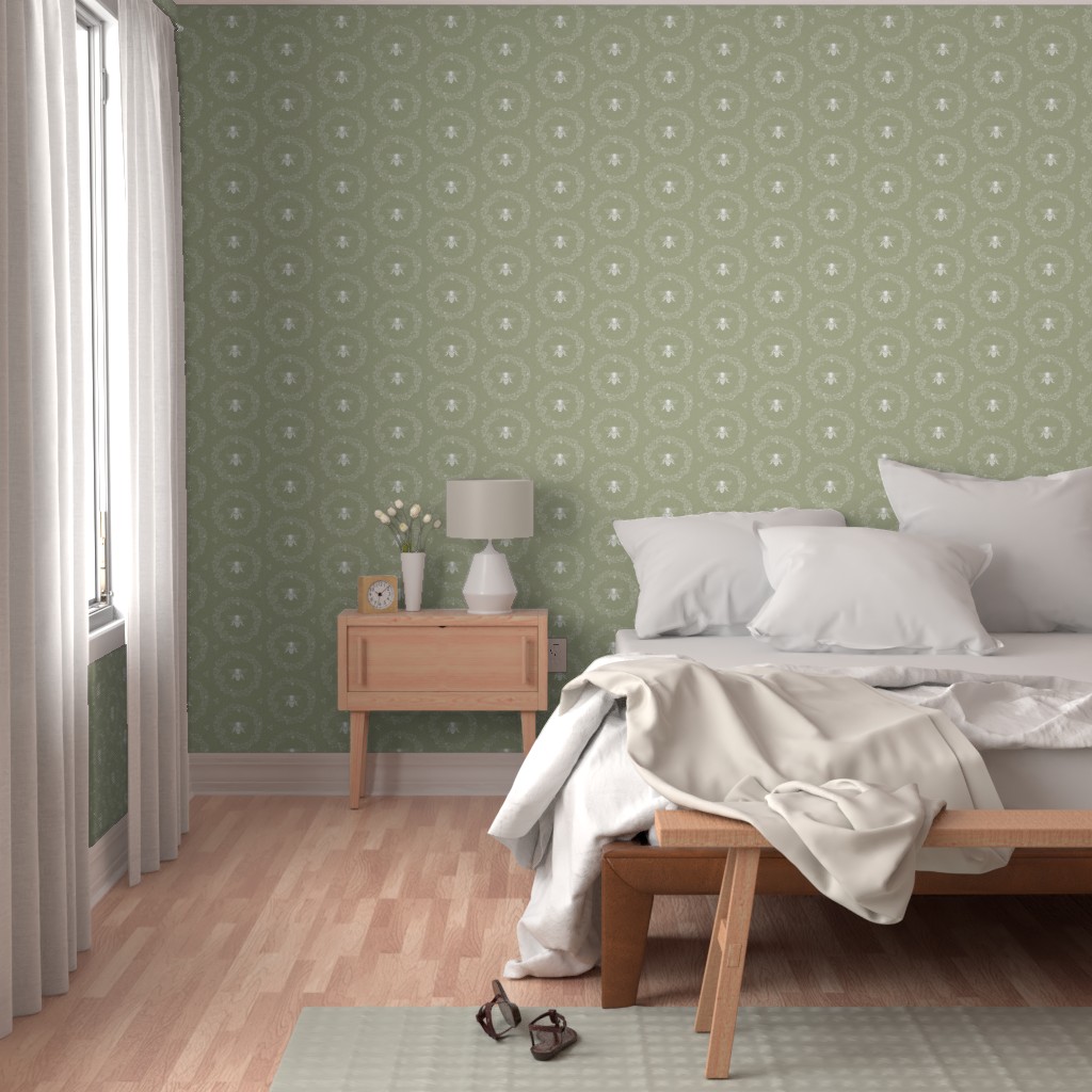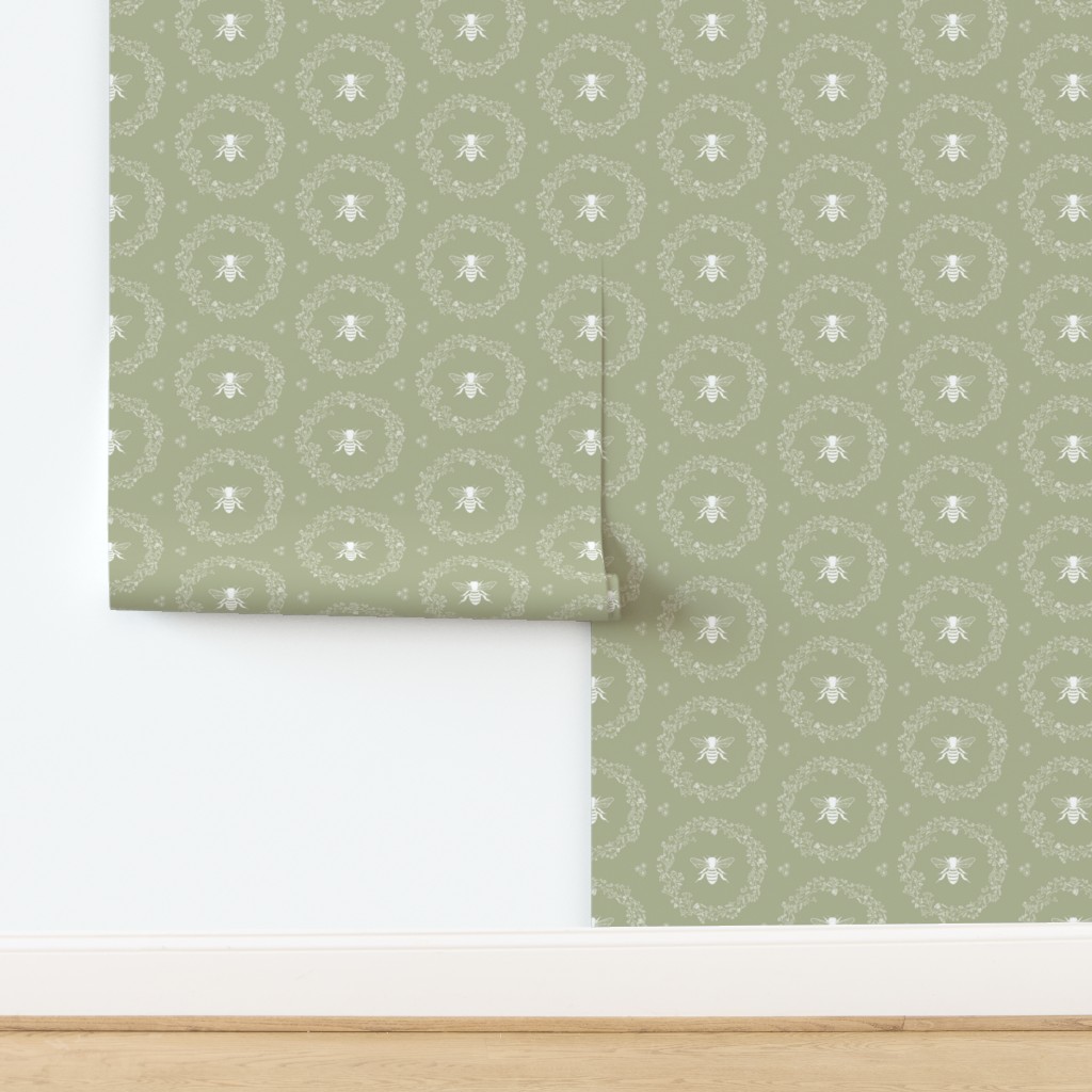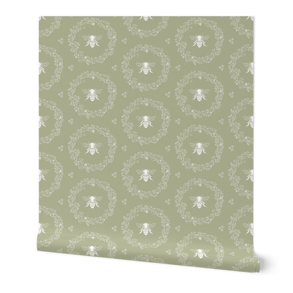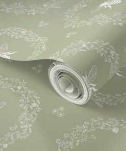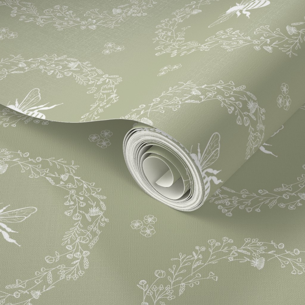 Invite the gentle hum of a summer garden onto your walls. Our Meadow Wreath wallpaper features an enchanting, hand-drawn motif of delicate floral crowns, each encircling a tiny, detailed honeybee. Rendered in a crisp white on a soothing Sage Green backdrop, this design captures the quiet magic of a woodland clearing.