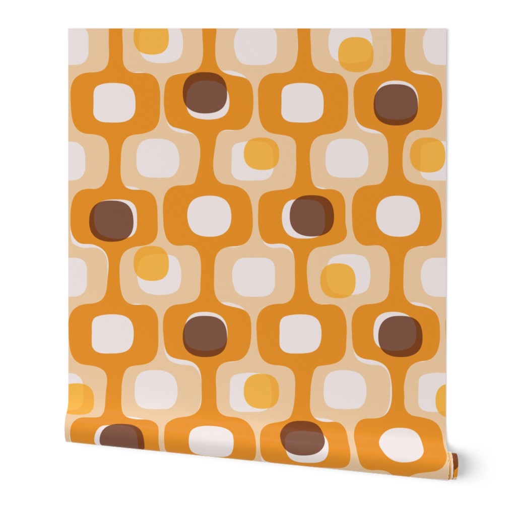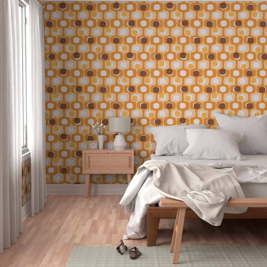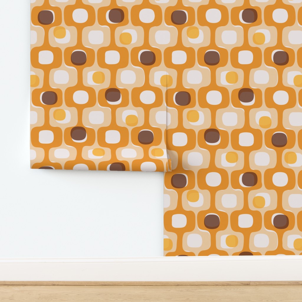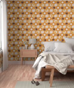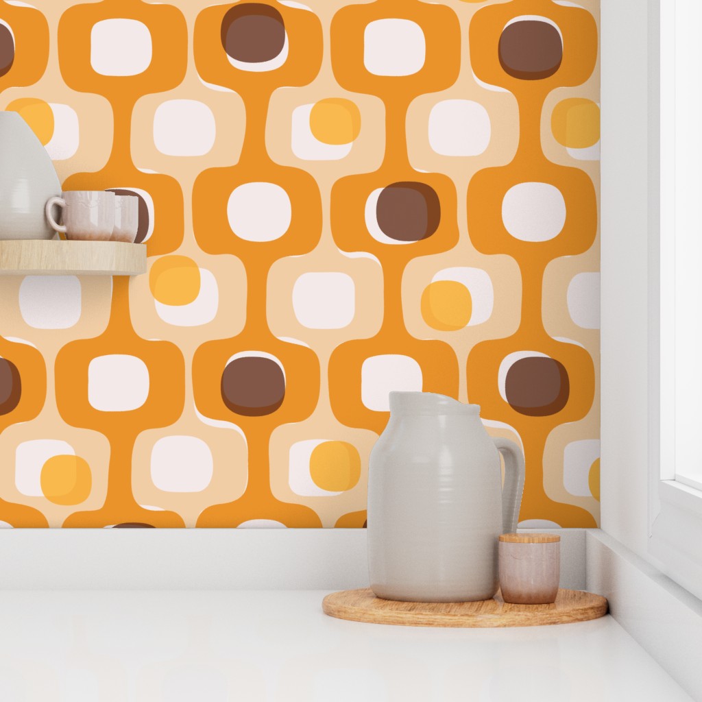 Turn your home into a time machine—in the best way possible. Our Groovy 70s Kitchen wallpaper is a love letter to the era of bold patterns and warm, communal spaces. Inspired by the iconic “Kitsch” style of the seventies, this medium-scale geometric features a soulful palette of vibrant orange, sunny marigold, earthy beige, and deep chocolate brown.